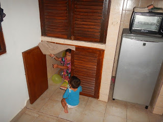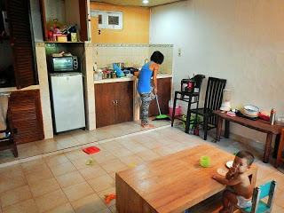 右の部屋、キッチンを掃除する嫁さんとカメラ目線の次男