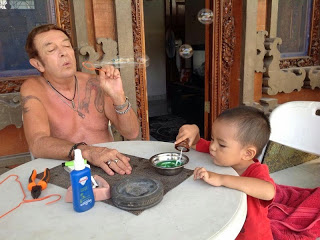 ミック爺さんとシャボン玉で遊ぶ坊主期の長男。息子たちにとってはお爺ちゃん家のような感じです。
