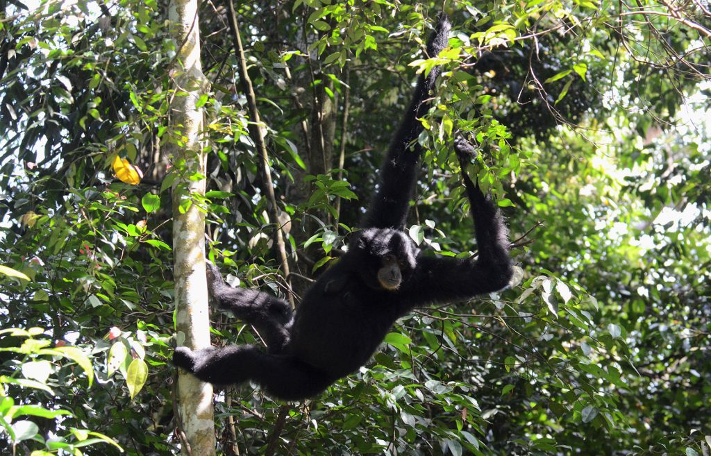 フクロテナガザルは、別名でSiamang(シアマン)と呼ばれ、インドネシアのスマトラ島やマレー半島のジャングルの樹上に生活する最大級のテナガザルです。
