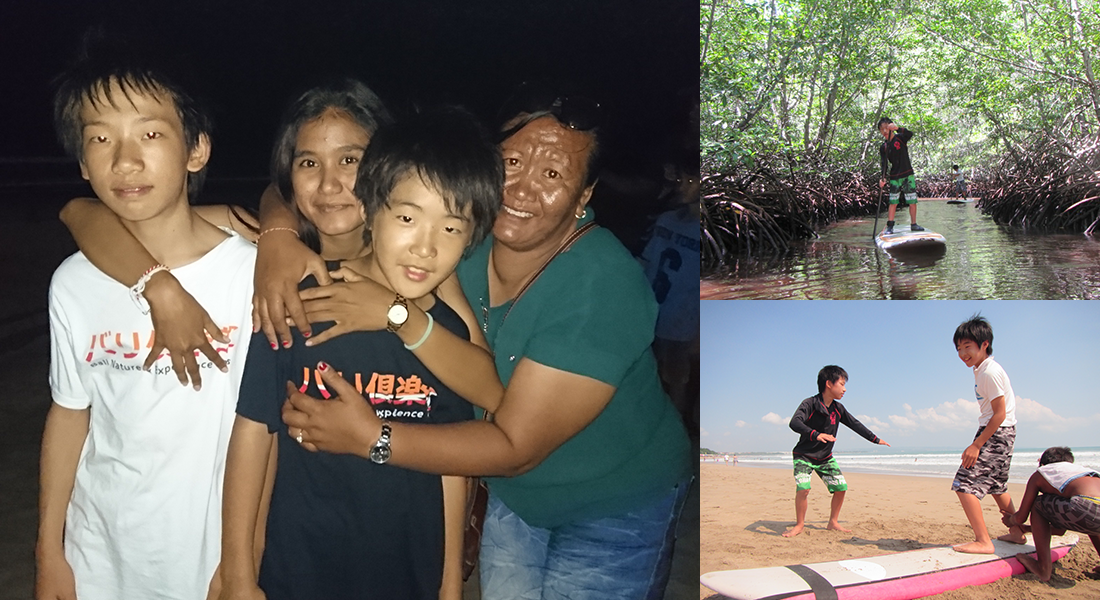 そこで今回は最初の一週間はバリ倶楽部のスタッフで日本語が通じる家族にお世話になり、日中はツアーに同行しながら、自然と触れあい、お客様に挨拶、スタッフに挨拶、してもらったことに対して感謝出来るよう、心がけてコーディネートしました。後半の1週間はこの流れでも良かったでしょうが、更なる壁にぶつかってもらうと、日本語が喋れない家族へホームスティしてもらい、時にローカルの学校へ体験入学し、放課後は地元の子供たちと海へ行って砂遊びや、サーフィン、サッカーなど、タブレットやインターネットなどが無くても自然遊びをすることでクリエイティブな発想が築け、様々な気付きが生まれたのではないかと思います。